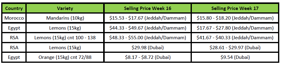 Last of the Egyptian Navels and Lemons are still available in the Saudi market, with large volumes of Egyptian Valencia oranges selling at average prices.