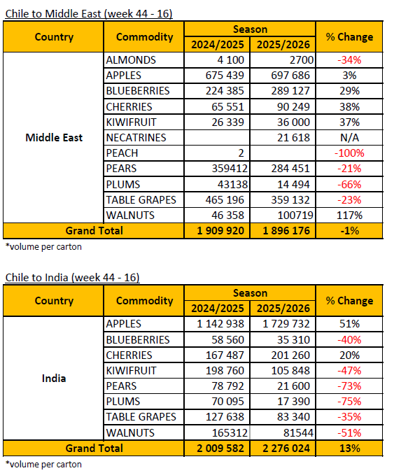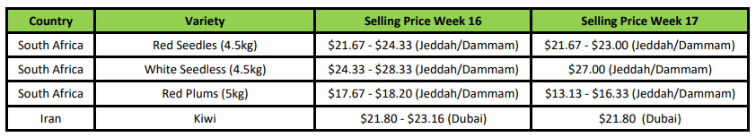 Kiwi fruit availability remains limited. Iran continues to supply limited volume via overland routes, with product being repacked and re-exported through Syria into Saudi Arabia. Despite this, there is still a potential opportunity for Chilean kiwi fruit, provided pricing remains competitive.