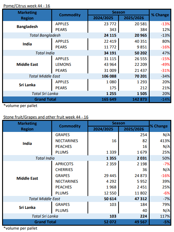 Market activity across most commodities in the Middle East remains slow, driven by ongoing uncertainty and continued rising logistics costs across both sea and road freight. However, the market remains optimistic, particularly for the upcoming South African soft citrus season. This is largely supported by reduced availability from Morocco and China. There is also less volume from China, with ongoing disruptions linked to the closure of the Strait of Hormuz .