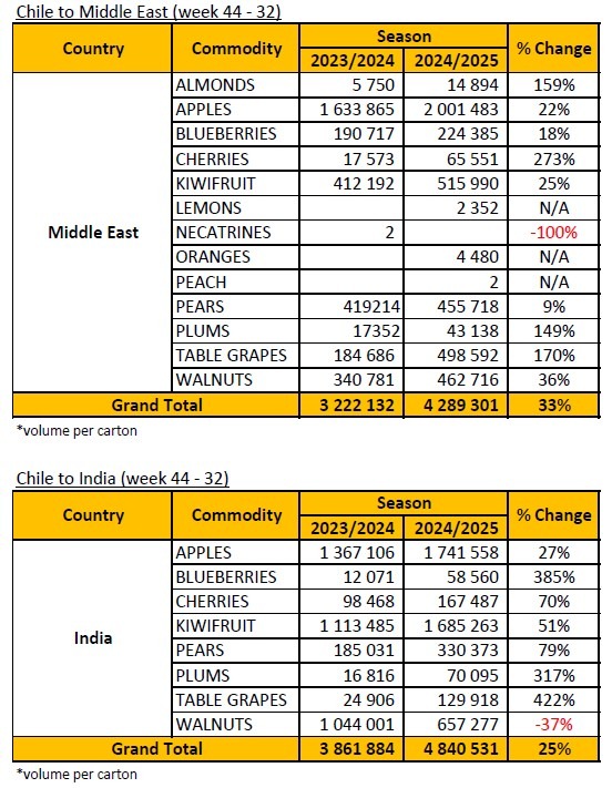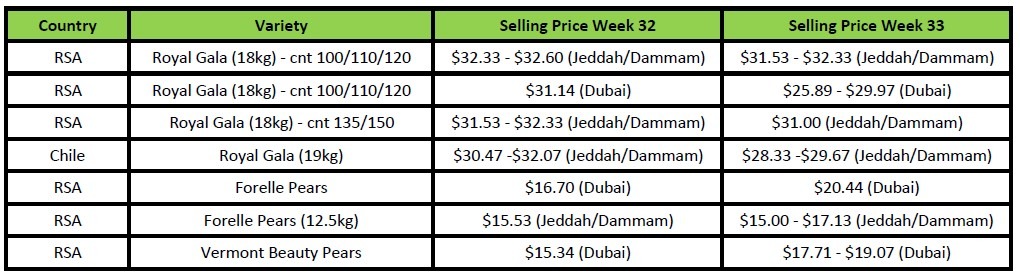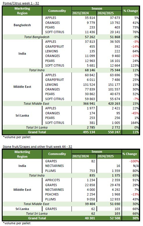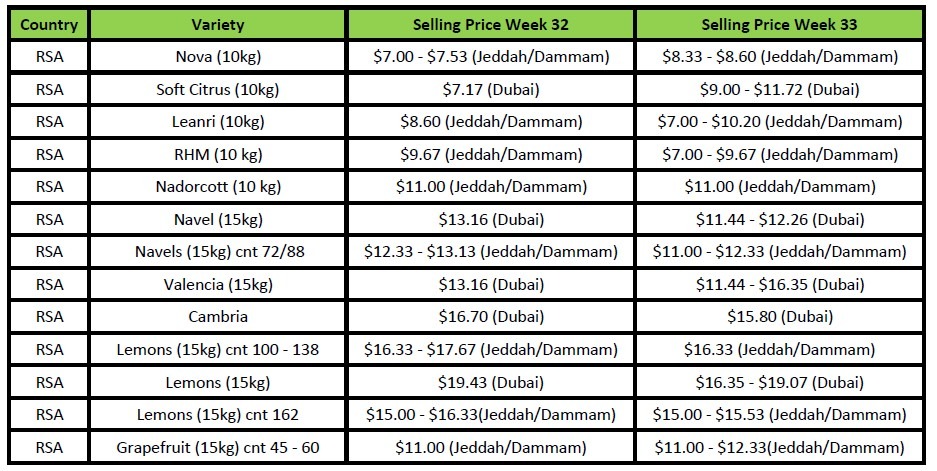 The Middle East market continues to experience downward pressure across all citrus and soft citrus categories, with slow movement overall. However, lemons and Cambria oranges have remained stable this week, while pears are showing steady week-on-week improvement.