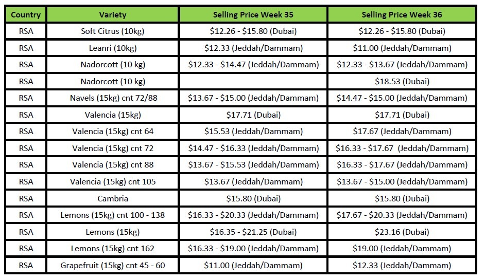 The overall market remains stable with minimal price fluctuations over the last week, however although the market has shown more positive response since the re-opening of schools and end of summer vacation, market concerns are on the high supply of citrus from South Africa en route to the market.