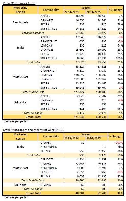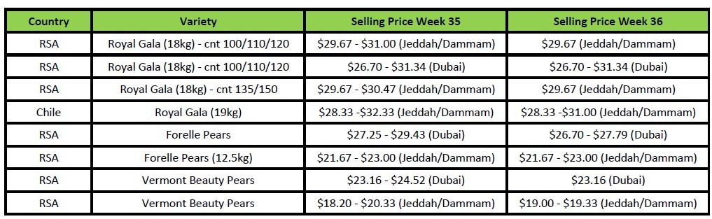 Apple prices are unchanged from last week. South African pears are performing well, in line with market expectations.