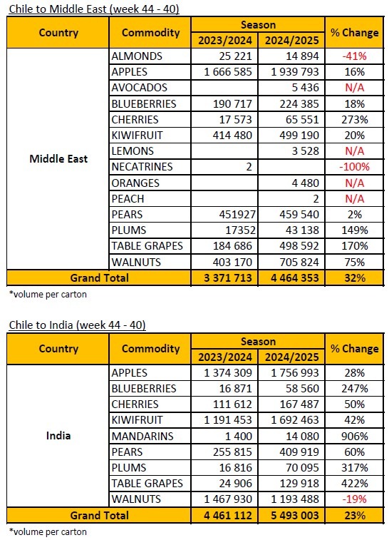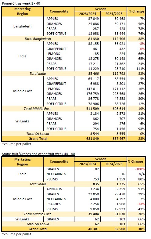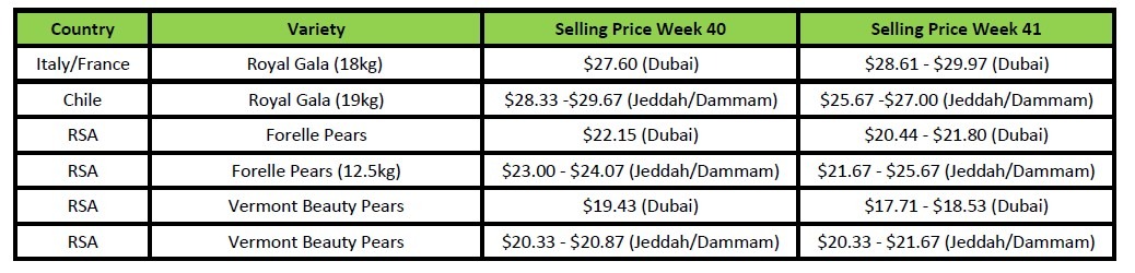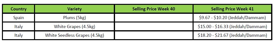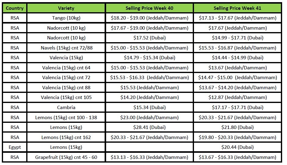The decline in Valencia prices is attributed to the large volumes shipped from South Africa to the Middle East during weeks 35-37.